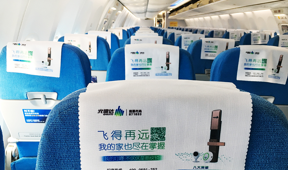 一進入機艙,每個座椅上醒目統(tǒng)一的頭片廣告,全艙集中呈現(xiàn),營造出一種沖擊力極強的視覺